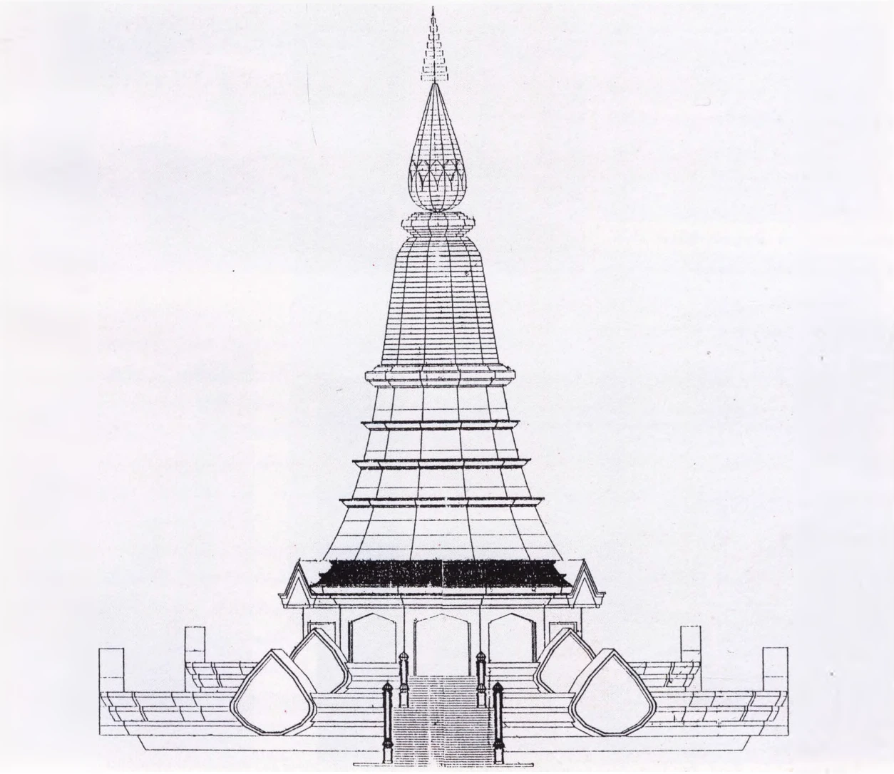 ประการแรกให้มีรูปทรงที่มีความละม้ายกับพระมหาธาตุนภเมทนีดล ซึ่งต่างไปจากรูปแบบของศิลปะล้านนาในอดีต เพื่อให้เป็นสถาปัตยกรรมใหม่ บนที่ที่สูงที่สุดของประเทศไทย การออกแบบรูปทรง เน้นการใช้เส้นตรงตัดกันเป็นรูปเหลี่ยม แสดงความหนักแน่น มั่นคง